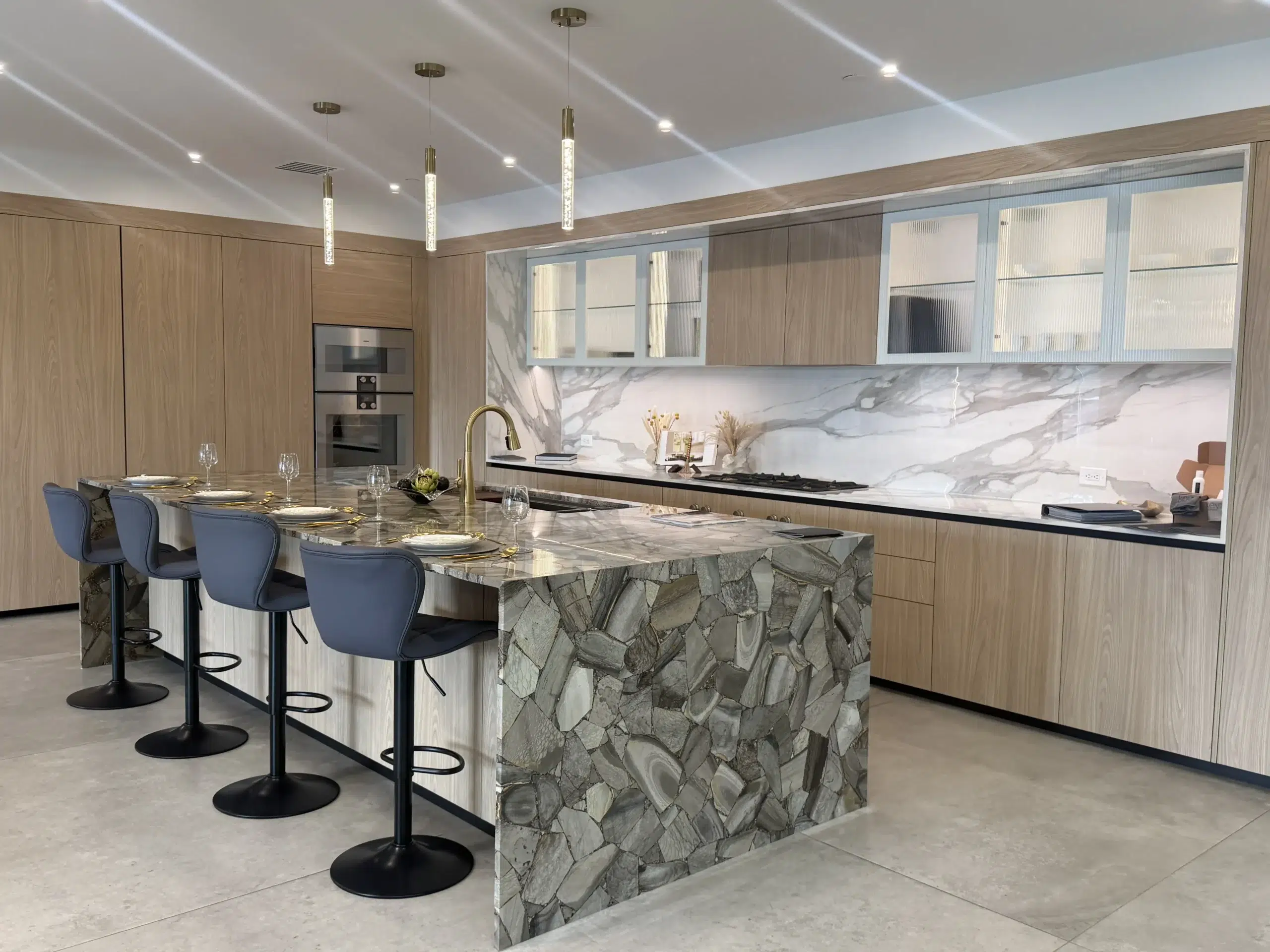 Elegant kitchen featuring a marble island, modern seating, and sleek cabinetry. Quartz countertops Granite countertops Quartzite countertops Marble countertops
